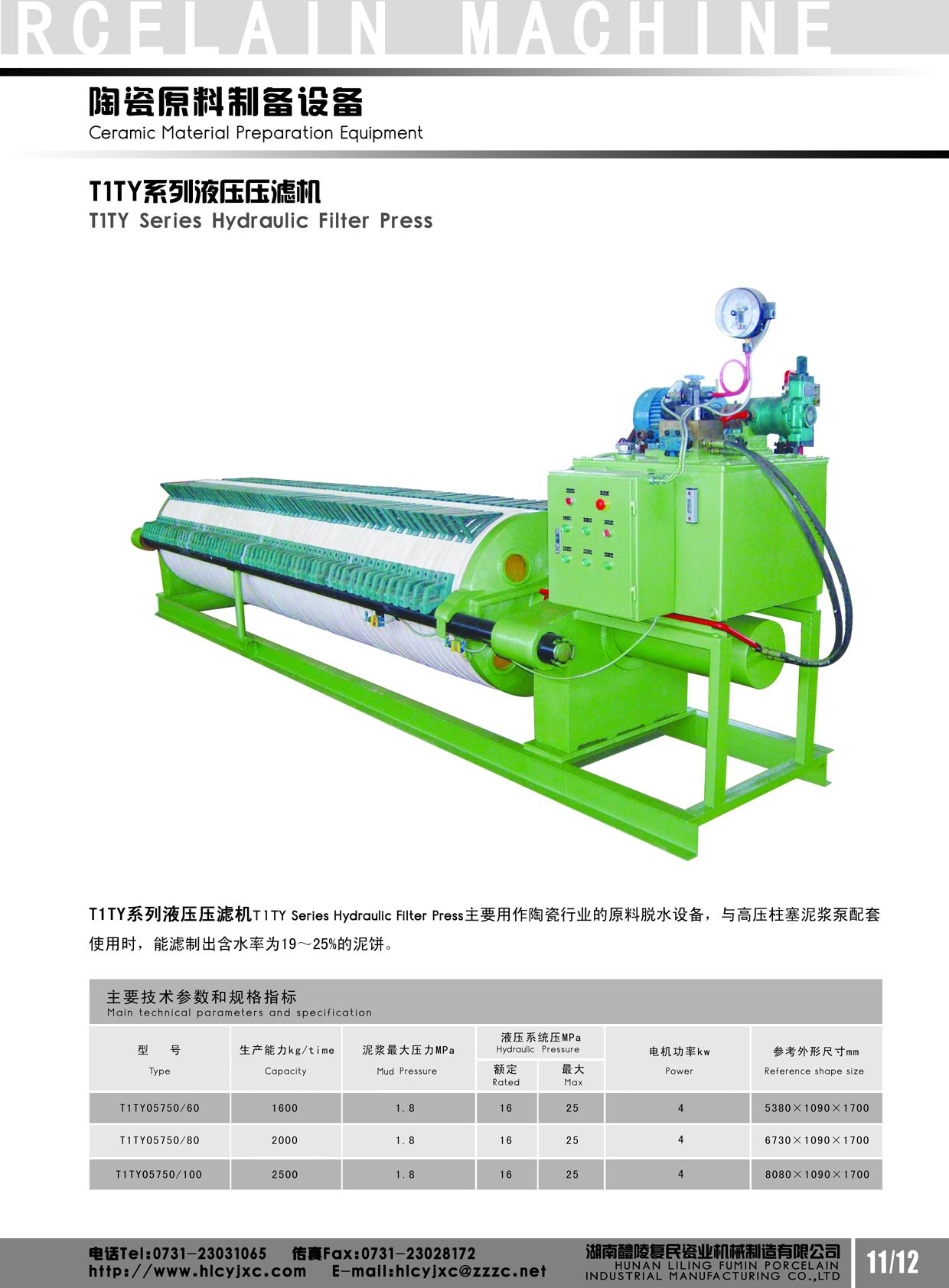 T1TY系列液壓壓濾機(jī)主要用作陶瓷行業(yè)的原料脫水設(shè)備,與高壓柱塞泥漿泵配套使用時(shí)能慮出含水率為19%-25%的泥餅。